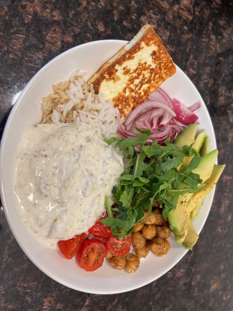 A dollop of plain yogurt introduces creamy tang and a gentle cooling effect. This is my secret ingredient – a smoky, dense dip/drizzle made by roasting or charring eggplant and blending it with olive oil, garlic, lemon and yogurt. It infuses the bowl with depth and complexity, bringing all the flavors together. Eggplant’s smoky sweetness is irresistible, and as a topping, it truly elevates the dish.