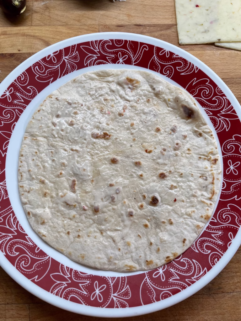 2. Spread the butter: Take a tortilla and spread a layer of softened butter over it. This will act as the base and help hold the veggies in place and prevent the tortilla from getting too soggy.