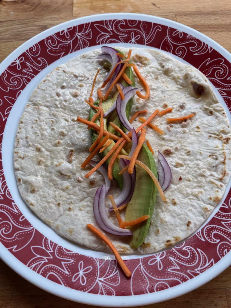 3. Layer the vegetables on top and across the tortilla.