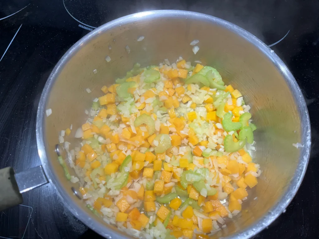 2. Stir in celery and butternut squash, letting them soften slightly.