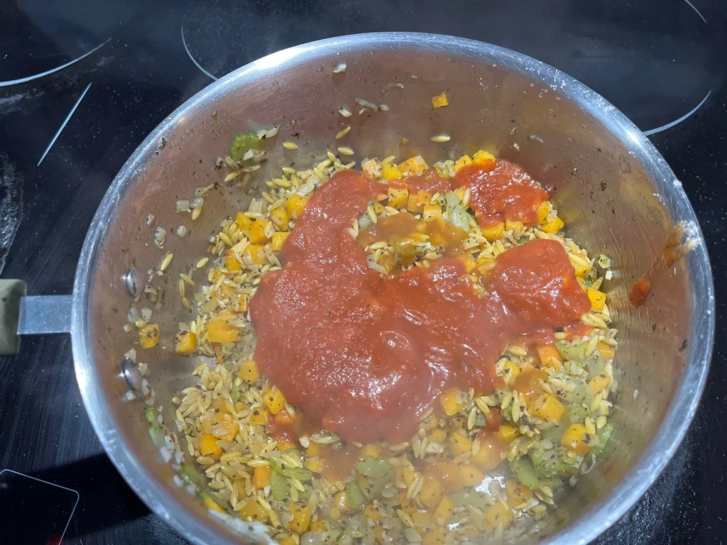 5. Add tomato paste and orzo, cook until slightly darkened.