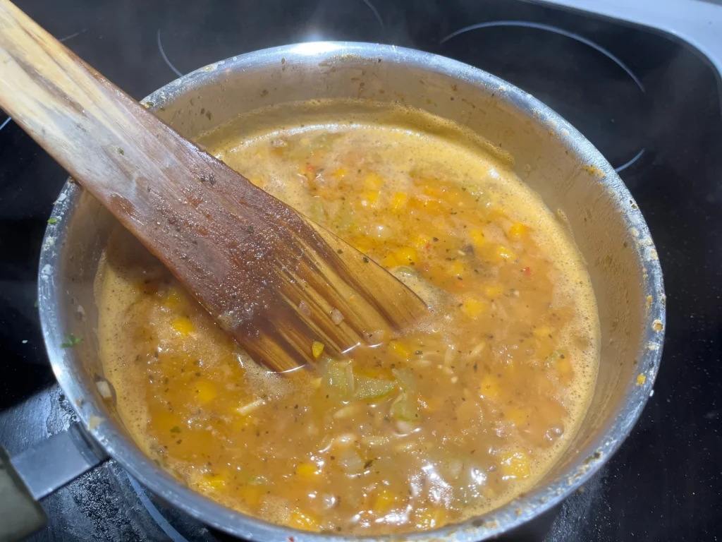 6. Pour in water or vegetable stock, then bring to a gentle simmer.